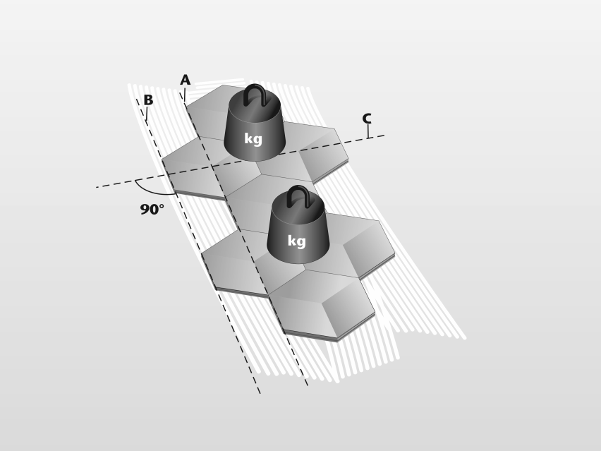 The two centre lines in the room (lines A and C) are marked by a chalk line or string at an angle of 90° to each other.