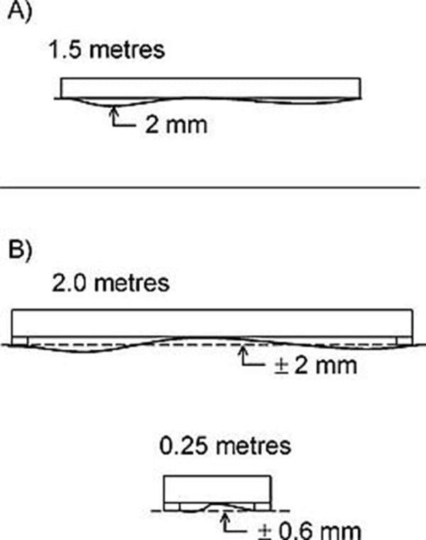 The subfloor must be flat with a maximum deviation of ± 2 mm under a 2 m straight edge (2 mm supports). The surface must be smooth. Any minor irregularities, e.g. across day joints, must be corrected so that the maximum localised deviation from flat level is ± 0.6 mm under a 0.25 m straight edge (0.6mm supports).