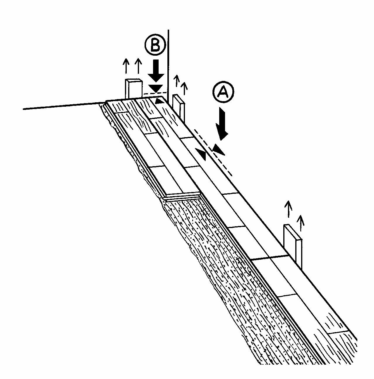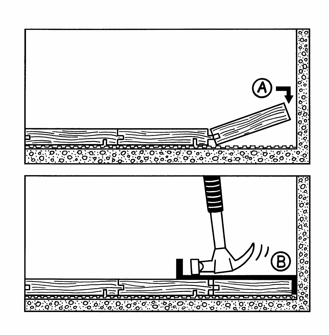 Use a joint puller (B) to slot the last board into place. Remove temporary spacers or wedges before installing skirtings