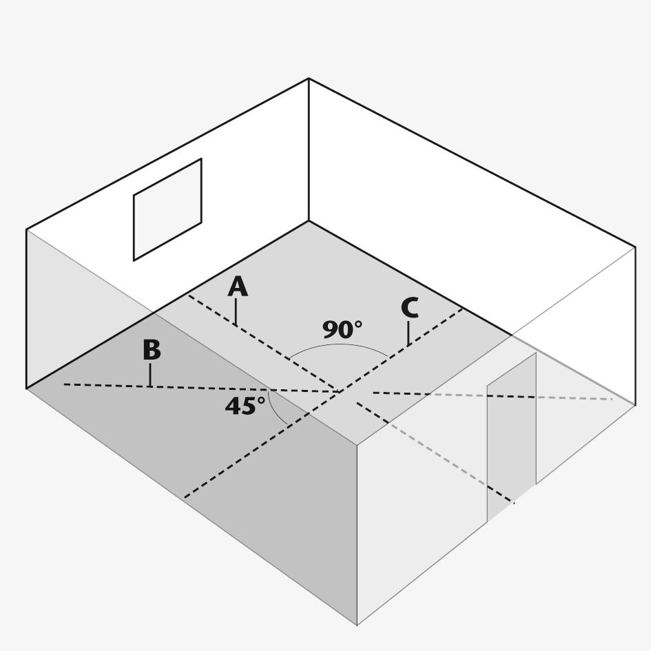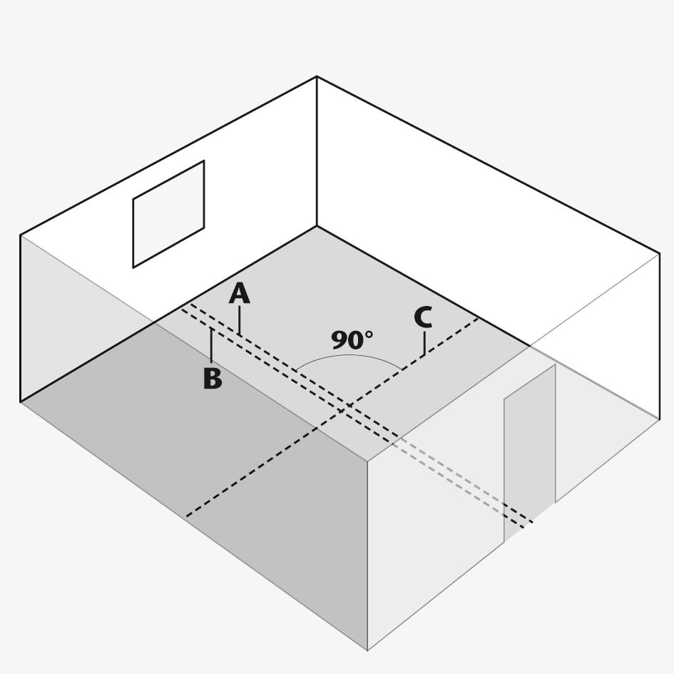 The two centre lines in the room (lines A and C) are marked by a chalk line or string at an angle of 90° to each other.