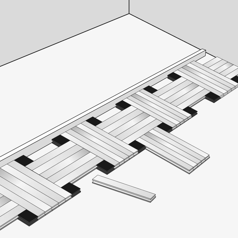 Before laying the staves, any subfloors must be levelled to a tolerance of no more than 3 mm gap showing under a 2m straight edge. The surface must be smooth with no roughness. Local irregularities must be levelled.