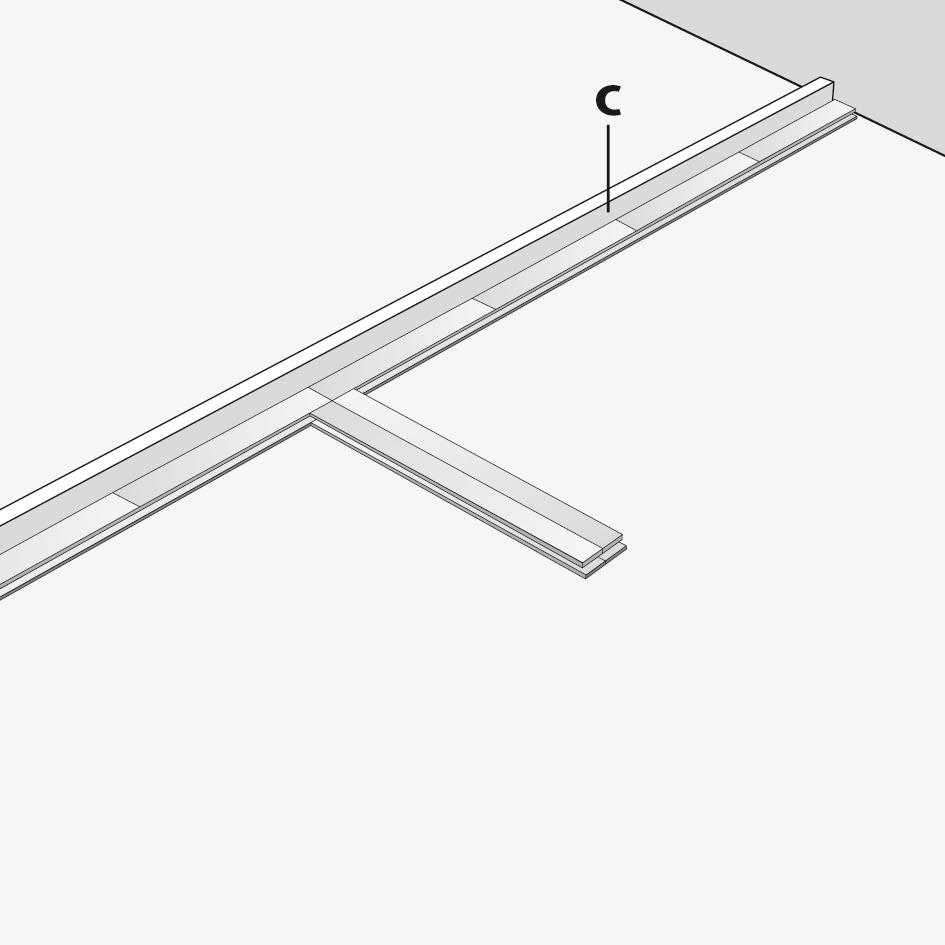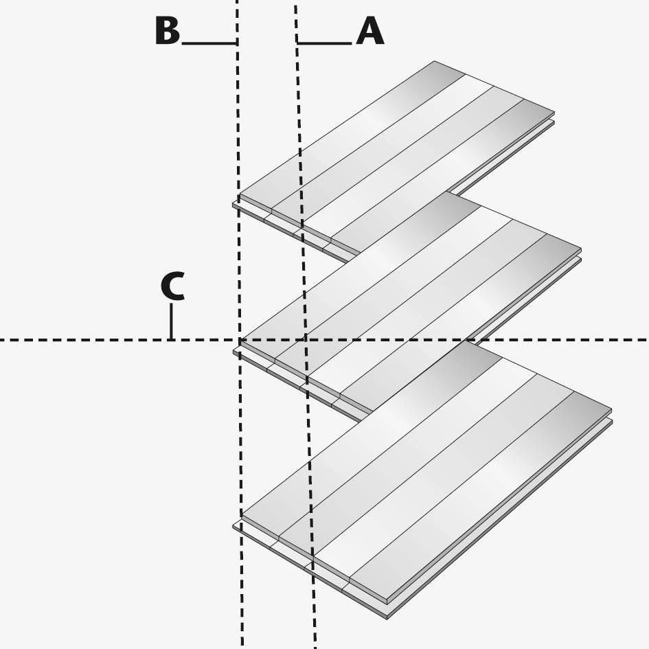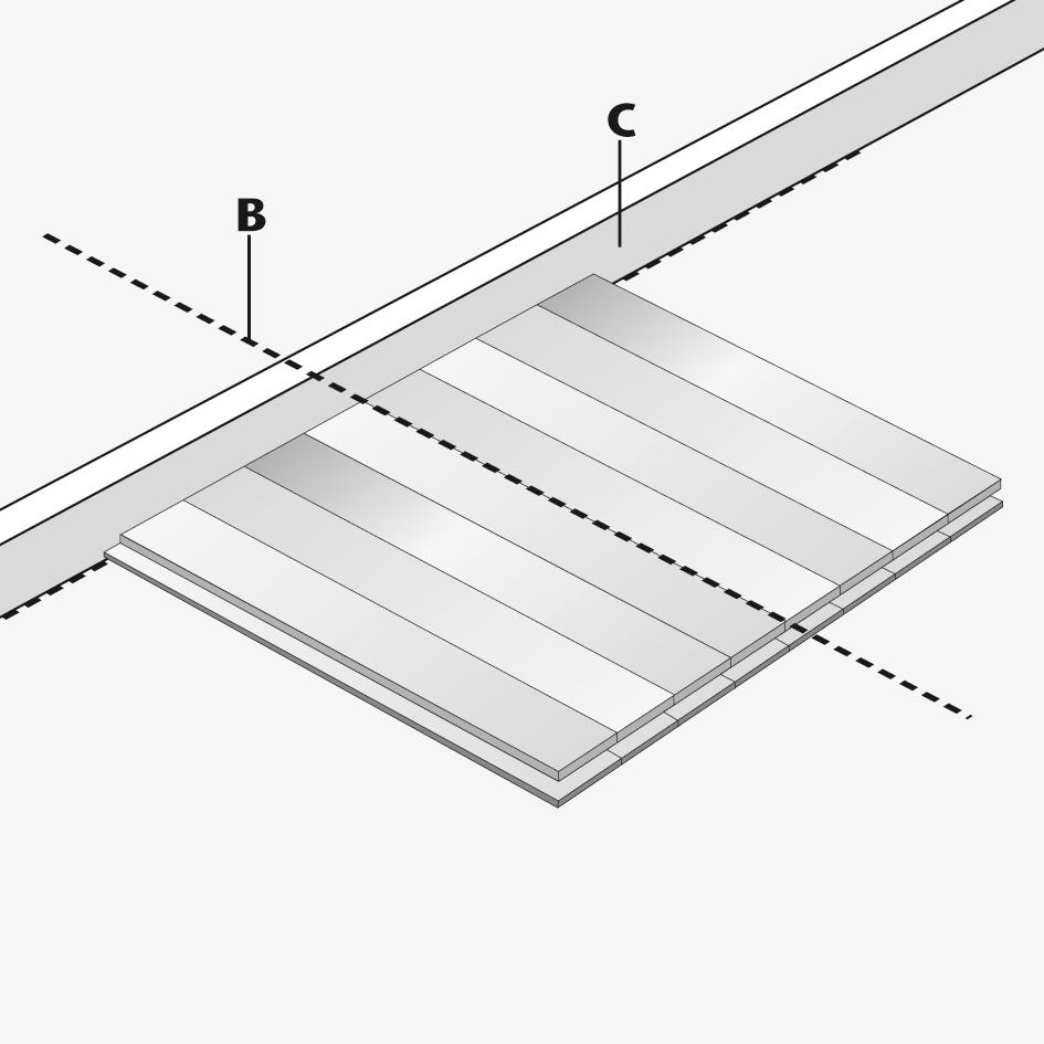 The starting row (the first row in blocks of 4 staves) is laid down through the room. The corners of the staves must be in line with the working line (line B). Particularly at the starting row it is very important that the staves are 100% square. Line C can be used to check the angle by ensuring that the corners be in line with this (see figure).