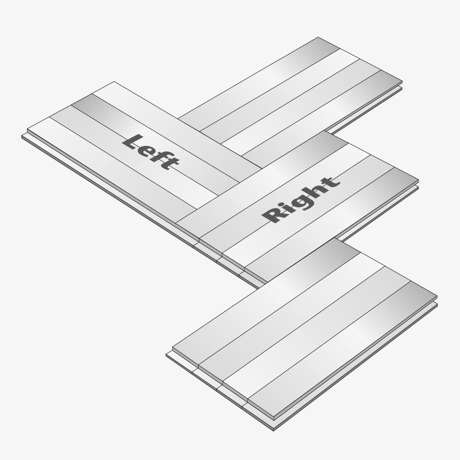 Depending on the parquet pattern, the staves are supplied in parquet bundles marked with right and left hand staves (see figure below). It is important to keep the staves separate until installation. For example, right and left hand staves are used in the herringbone pattern.