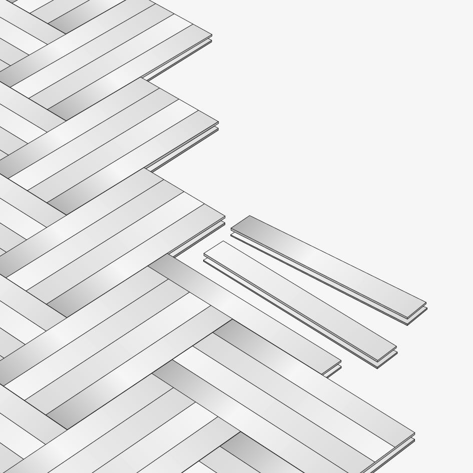 The staves can be screwed, nailed or glued to a subfloor of plywood / existing wooden floor or screwed or glued to a chipboard base. Furthermore, they can be glued down to a concrete or screeded subfloor. The moisture content of a wood based subfloor must not exceed 12% and for concrete/screeded subfloors it must not exceed 75% RH. When screwing or nailing, a 500 g/m² floor cardboard is to be inserted between the wooden subfloor and the staves in order to minimize creaking between the staves and the subfloor. Each stave is fixed by secret nailing/screwing at a 45º angle with at least 2 nails or screws per stave.