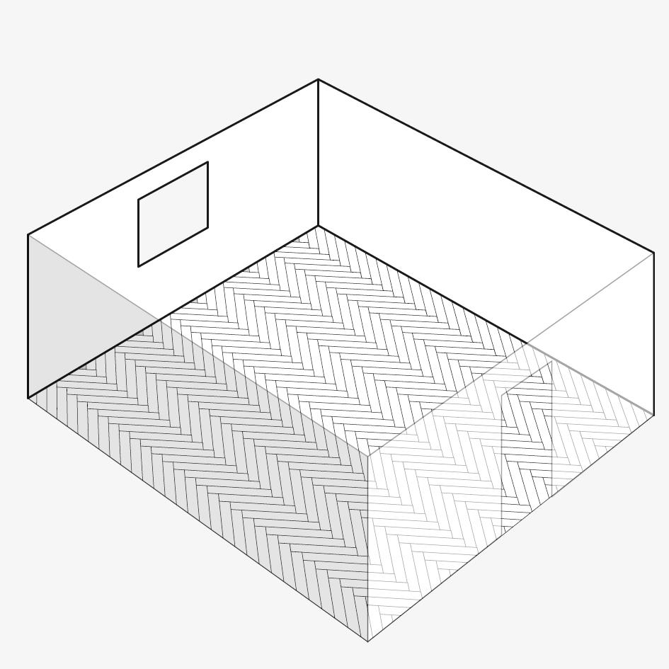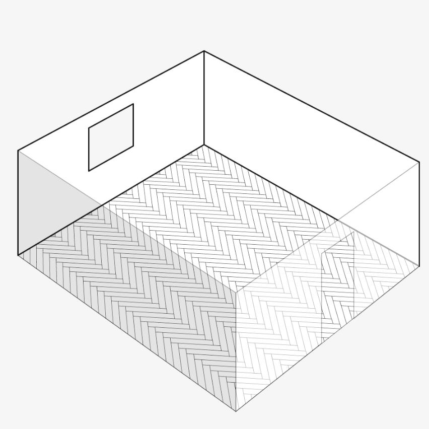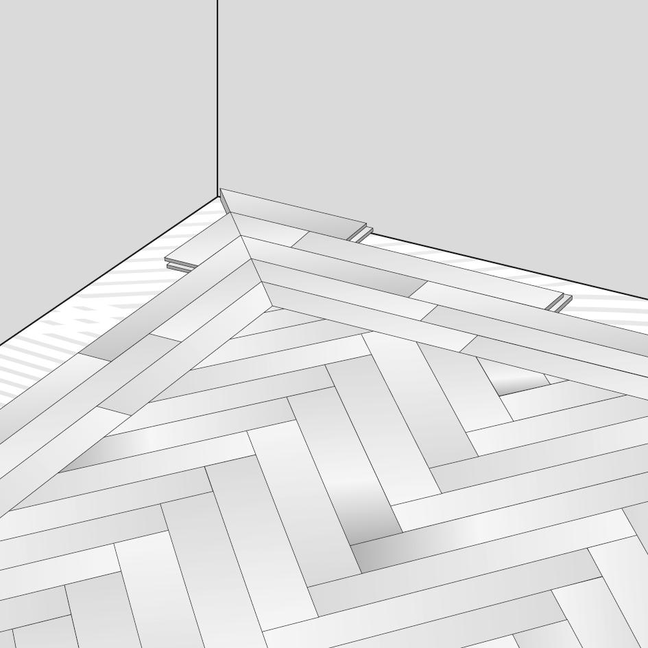 The floor can be beautifully framed with a border in the same wood species as the rest of the floor or in another wood species if you want more contrast. The description below is for a floor in herringbone pattern.