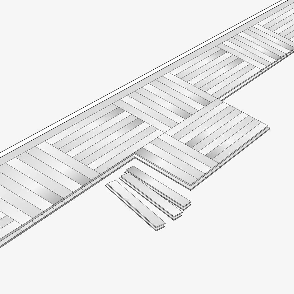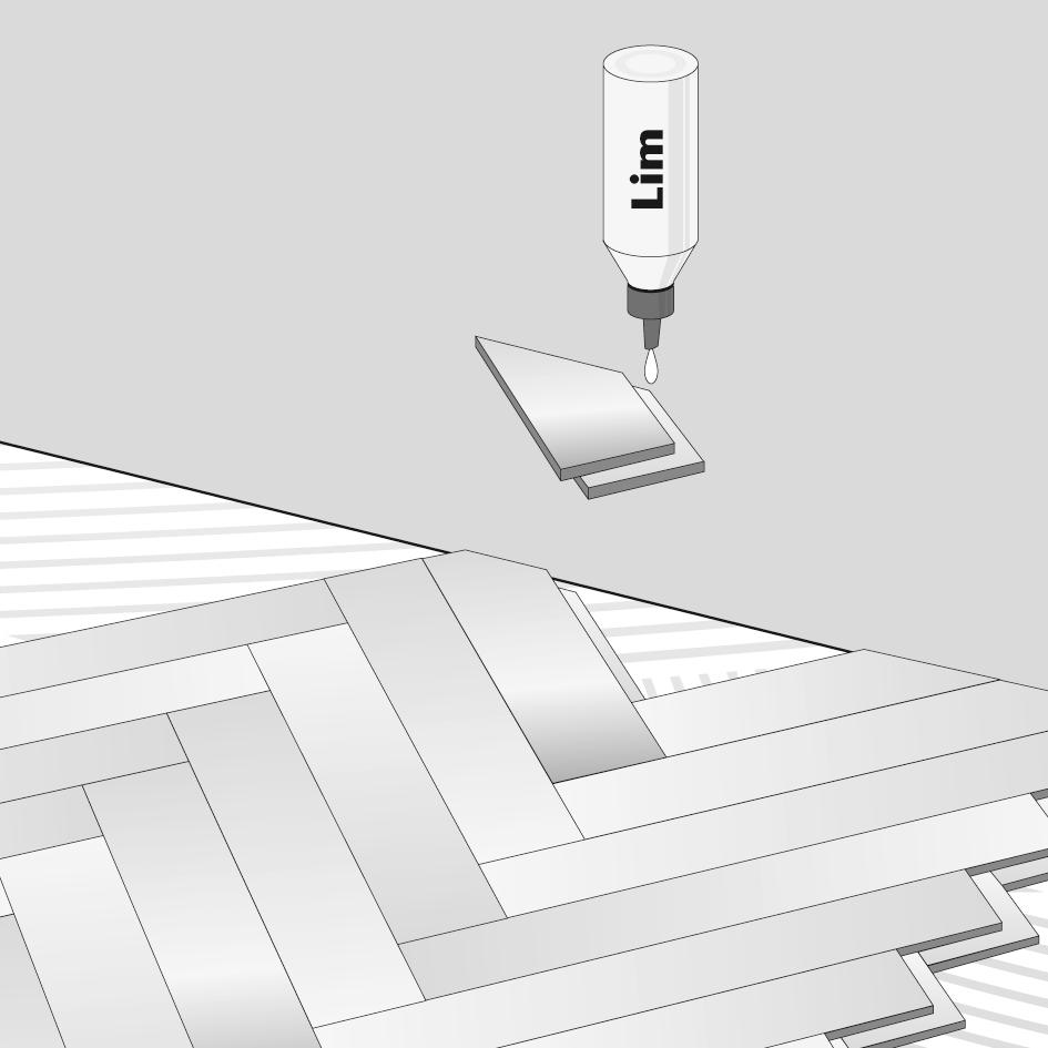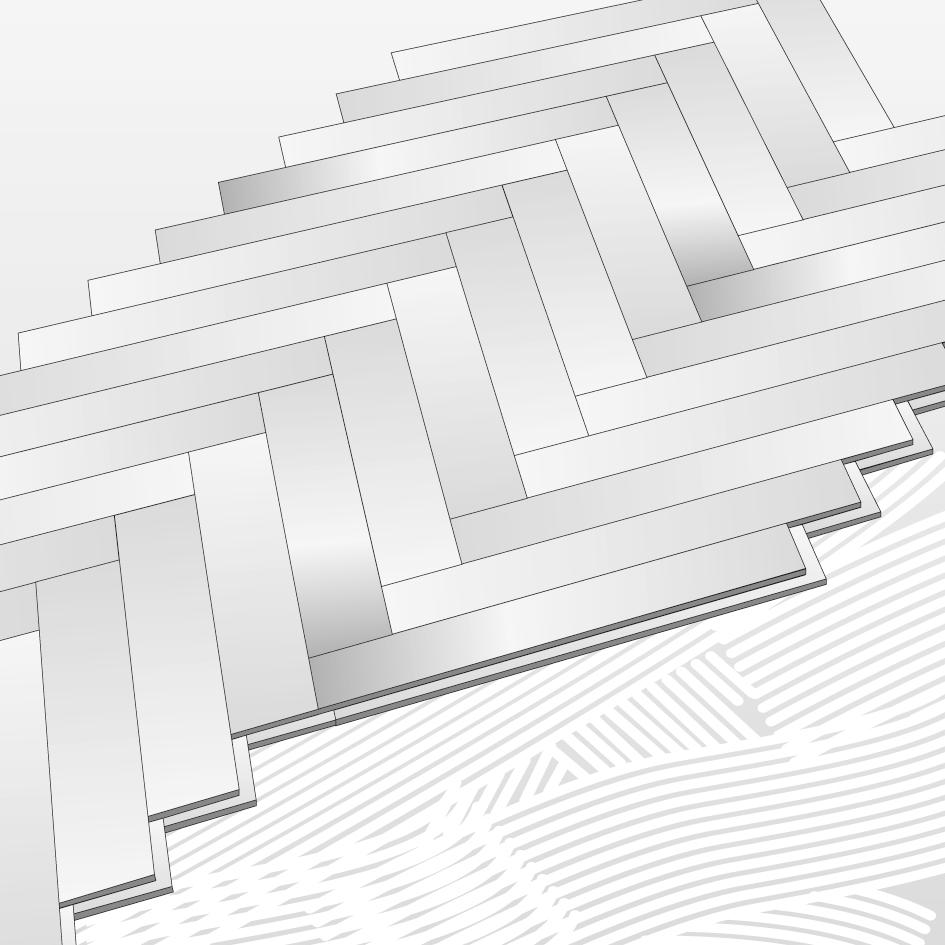 The staves are glued down in squares laying at an angle of 90° to each other. Alternate right and left staves.