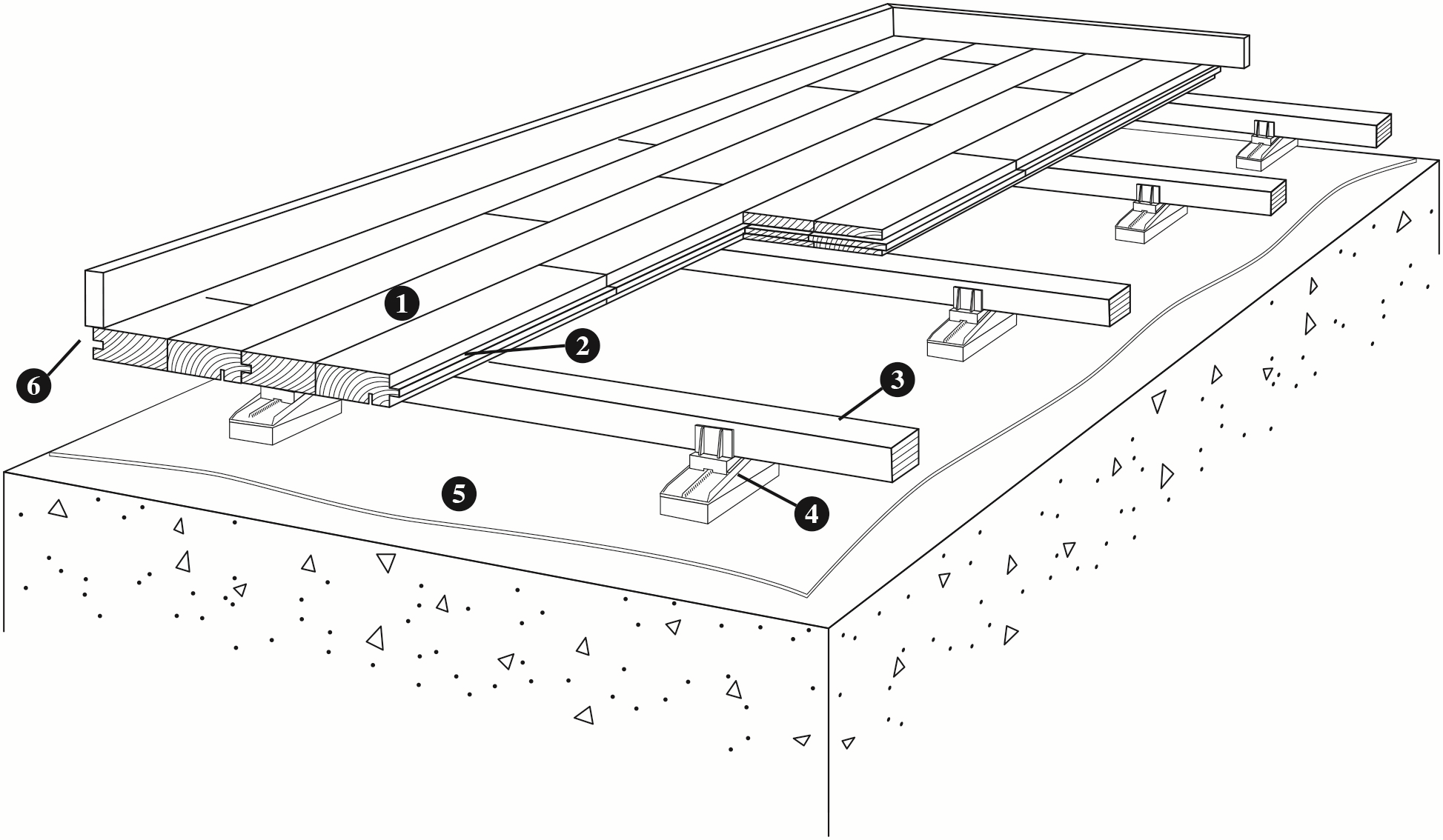 Construction height from 78 mm (39 x 40 mm battens and 22 mm floor boards). Bases to reach a maximum height of 225 mm (63 x 40 mm battens) are available with the system.