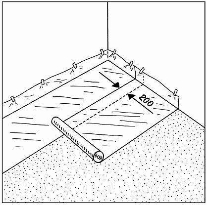 The moisture barrier is laid with an overlap of 200 mm at all joints, continuing up walls, etc.