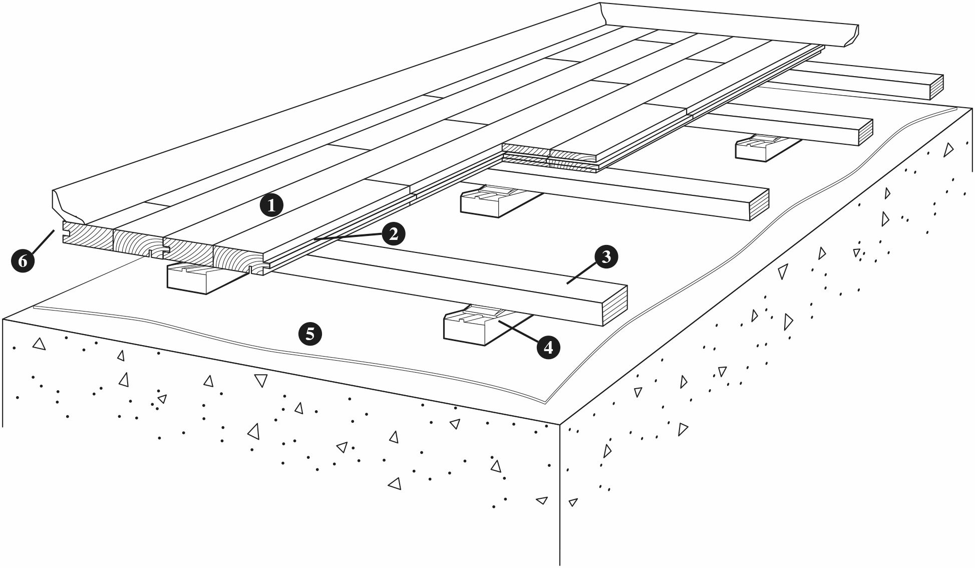 22 mm solid boards nailed to a substructure of prefabricated battens. Manufactured as a single layer structure of 25.5 x 60 mm veneered battens with 12 mm shock pads premounted in a recess at the underside of the batten at the packing points. Before laying out the battens, the enclosed J-Lock Wedges or J-Lock elements are clipped-on to the shock pads. Batten centres, 336 or 411 mm, is determined depending on the expected sports functional characteristics and/or strength.