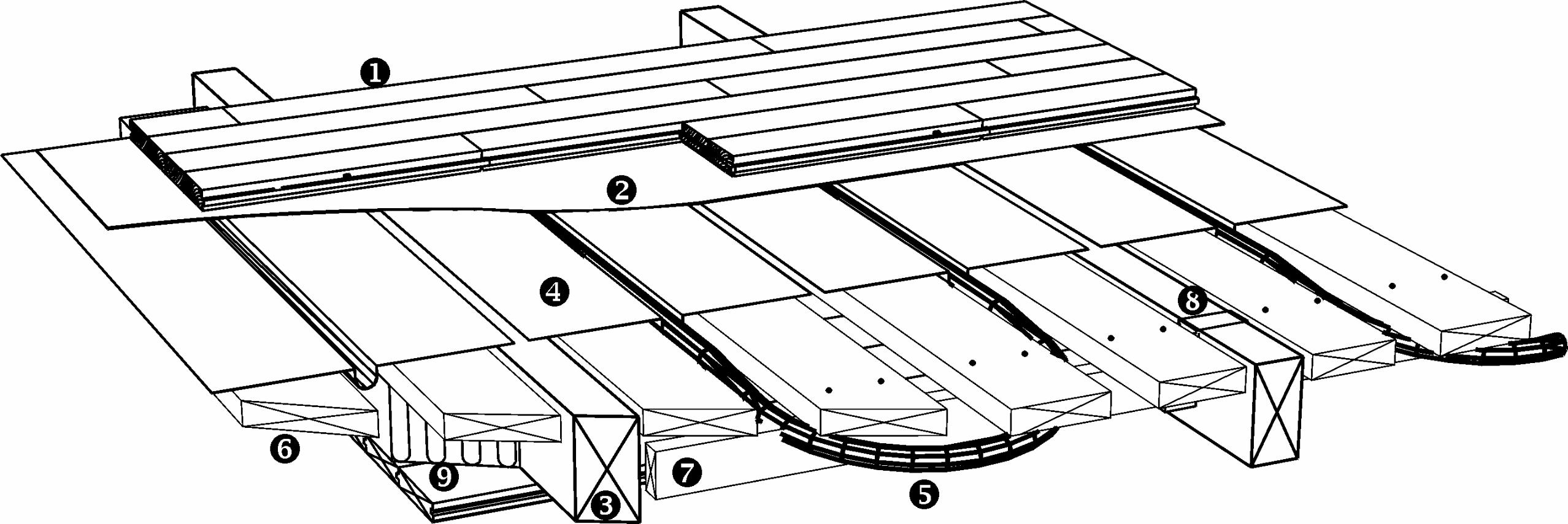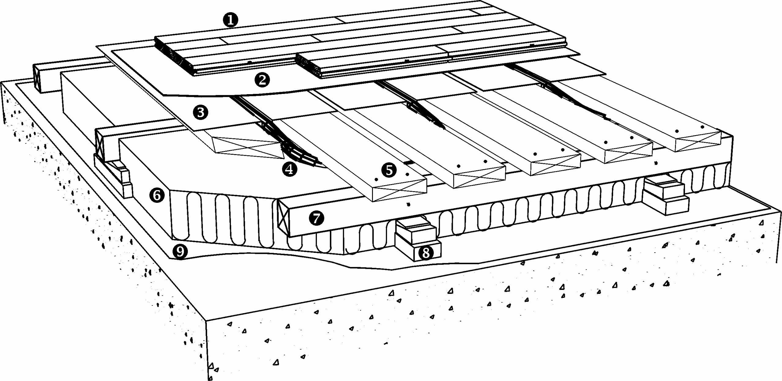 2-strip boards or planks can be nailed to a self-supporting underlay of bearers mounted on battens/joists. Heat-distribution plates, in which heating pipes are installed, are fixed on to the bearers.
