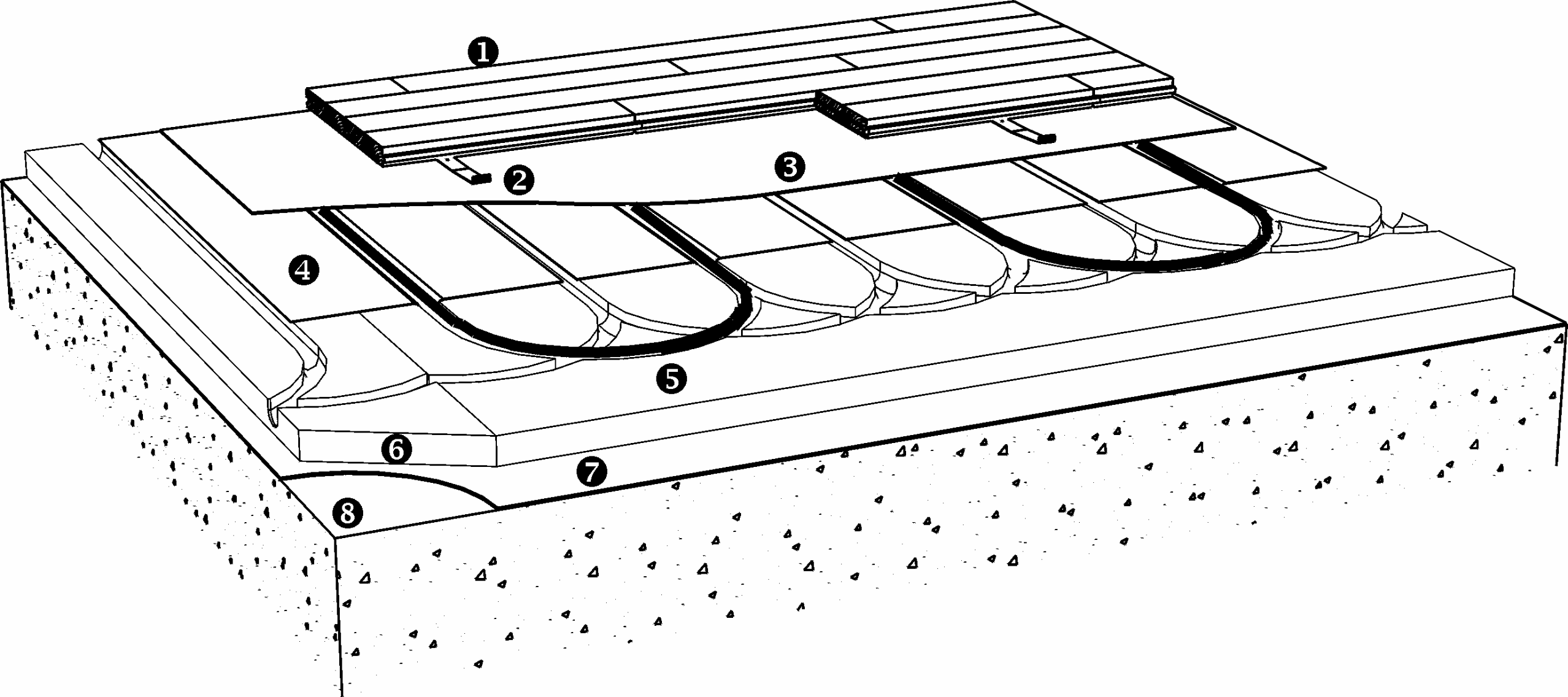 CLIP SYSTEM ON SUBFLOOR WITH CAST-IN HEATING PIPES