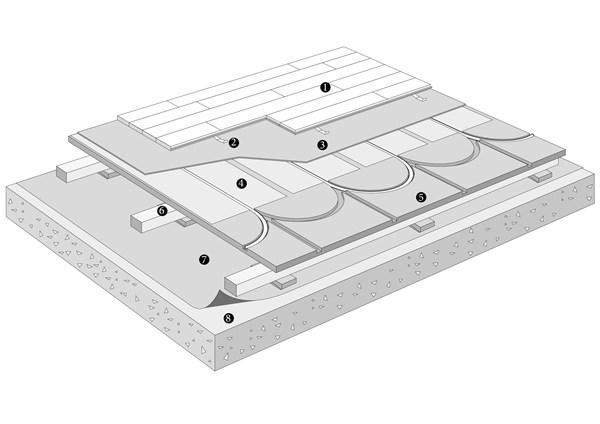 The clip system can be laid on an underlay of polystyrene with the heating pipes set in heat-distribution plates. The intermediate layer is floor cardboard, 500 g/m². This system is not suitable for sports applications.