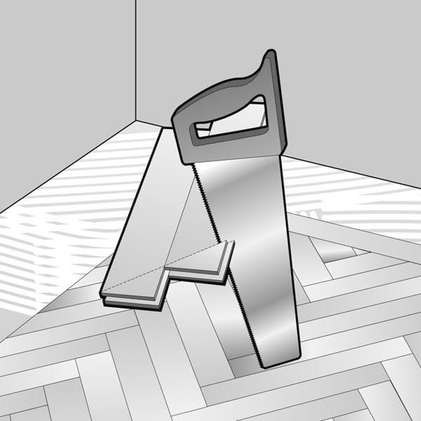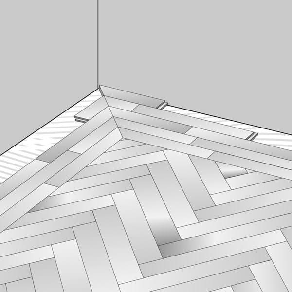如果木地板要在墙边安装边框,必须按照有关边框的计划宽度与指定的墙壁间距进行切割,例如:2 x 木块宽度 + 墙壁间距。