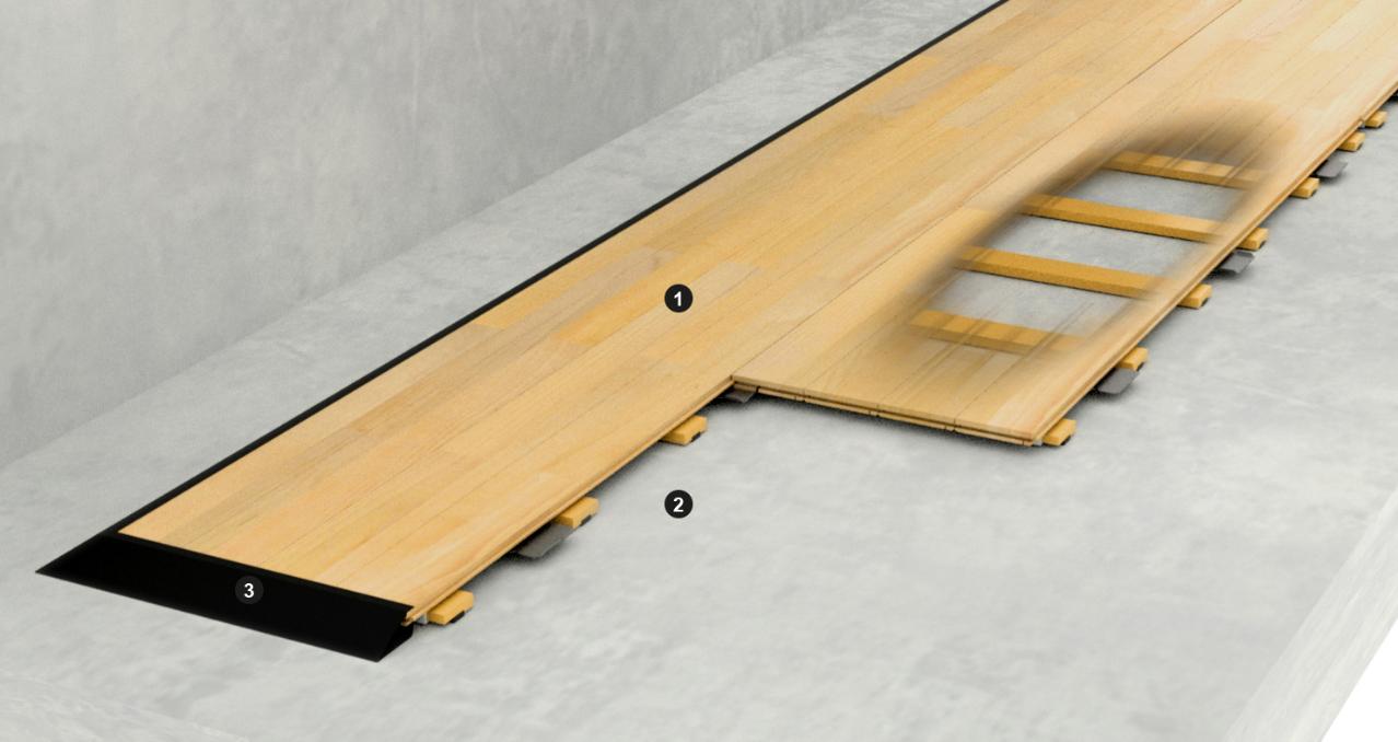 The Pro Complete 44 system consists of 22 mm solid hardwood parquet. The floor boards are preassembled into light weight, hand carried panels.
